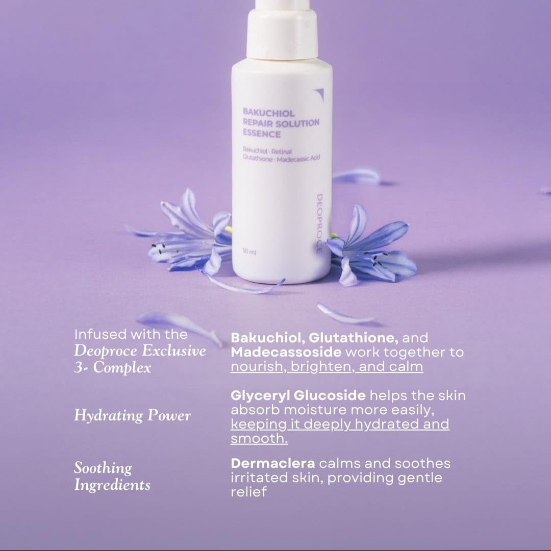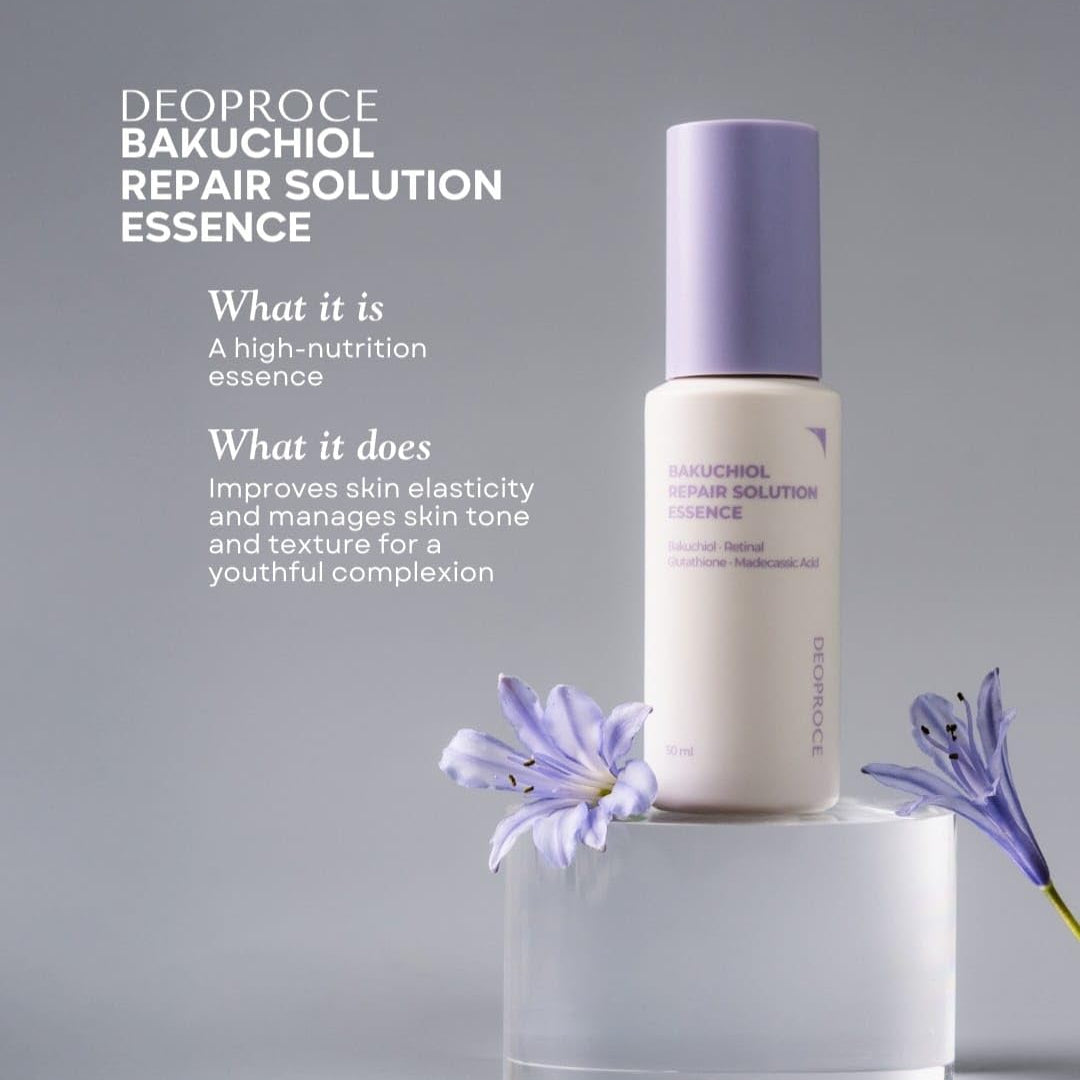 Deoproce Bakuchiol Repair Solution Essence is a premium Korean skincare essence that combines Bakuchiol, a gentle plant-based retinol alternative, and Retinal (Vitamin A derivative) for powerful anti-aging benefits without irritation.