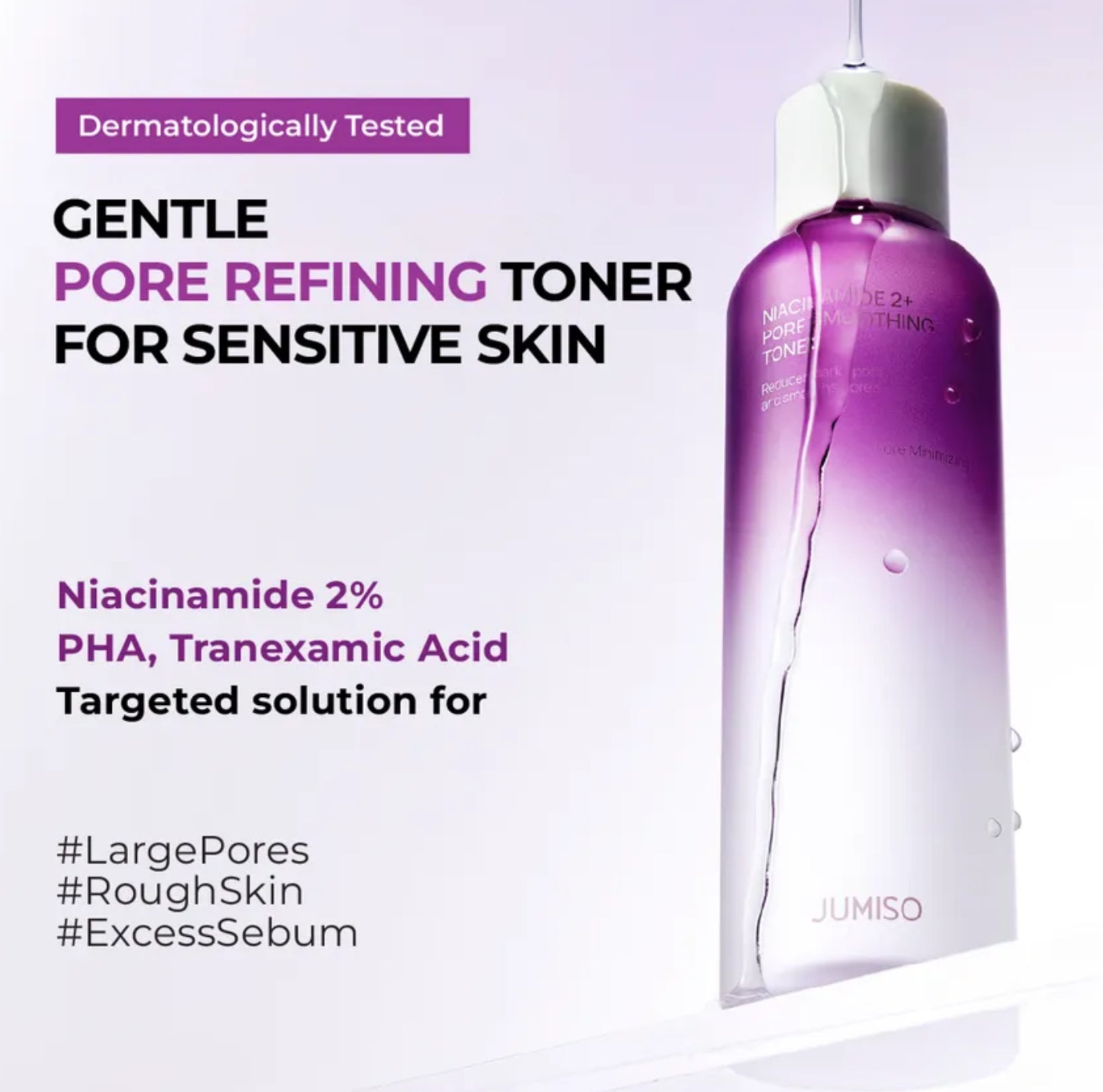JUMISO Niacinamide 2+ Pore Smoothing Toner is an ultra-lightweight product that hydrates while refining skin texture and reducing the appearance of pores. Enriched with 2% Niacinamide, Tranexamic Acid, and Glutathione, it prepares and smooths the skin for a brighter, more even complexion.