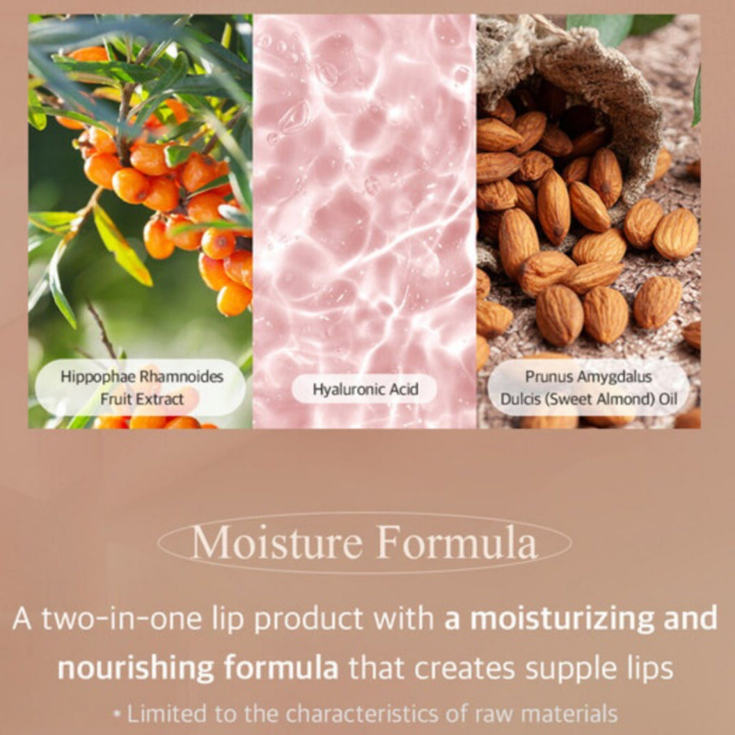 Moisturizing Benefits: Hippophae Rhamnoides Fruit Extract, Hyaluronic Acid, and Sweet Almond Oil deeply moisturize and nourish lips, promoting healthy condition.
