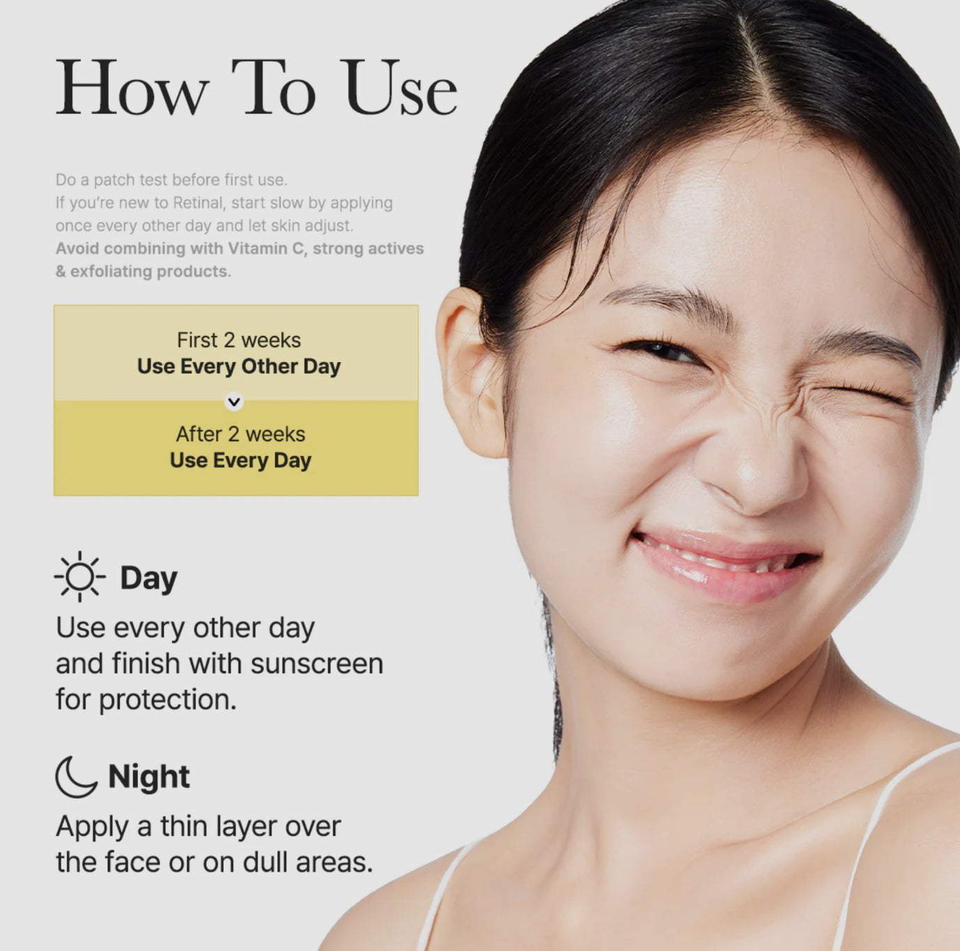 - Night: Apply evenly over the face or to dull areas for overnight skin renewal.