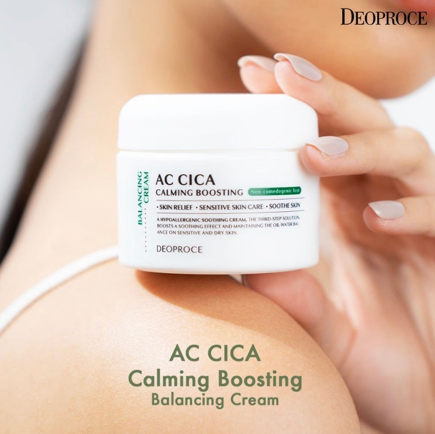 Deoproce AC Cica Calming Boosting Balancing Cream is a luxurious Korean moisturizer designed to hydrate and soothe sensitive skin. Packed with Centella Asiatica extract, panthenol, and natural botanical extracts, it calms irritation, reduces redness, and strengthens the skin’s barrier. Perfect for daily use, this lightweight cream balances moisture levels, leaving your skin refreshed, radiant, and deeply hydrated. Embrace the ultimate skincare solution for a serene, glowing complexion.