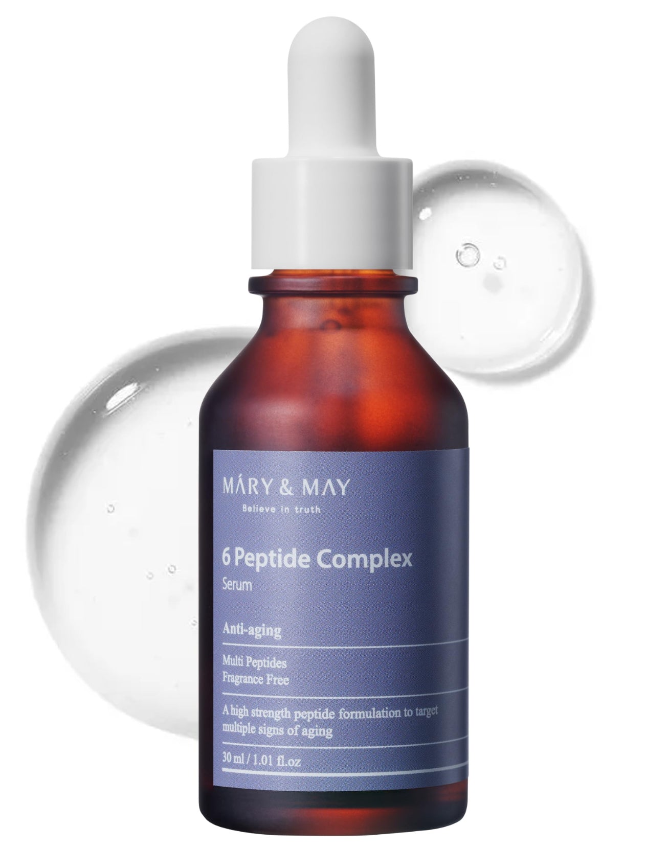 Mary&May 6 Peptide complex Serum contains six powerful peptides that promote skin regeneration and reduce the look of wrinkles. Its lightweight, fast-absorbing formula nourishes and firms the skin without leaving a greasy residue. Formulated with EWG green-grade ingredients, this serum is free of harmful substances like parabens, artificial fragrances and colorants, alcohol, mineral oils, surfactants, and allergens. It effectively prevents signs of aging and restores firmness and hydration to the skin.