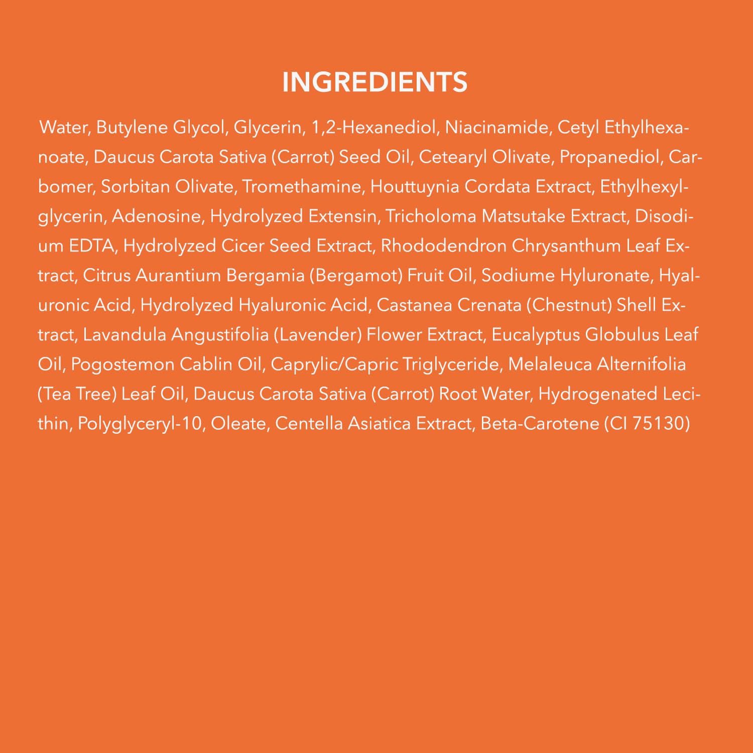 Water, Butylene Glycol, Glycerin, 1,2-Hexanediol, Niacinamide, Cetyl Ethylhexanoate, Daucus Carota Sativa (Carrot) Seed Oil (10,000ppm), Daucus Carota Sativa (Carrot) Root Water (10ppm), Hydrolyzed Extensin (300ppm), Houttuynia Cordata Extract, Sodiume Hyluronate, Hydrolyzed Hyaluronic Acid, Hyaluronic Acid, Centella Asiatica Extract, Castanea Crenata (Chestnut) Shell Extract, Lavandula Angustifolia (Lavender) Flower Extract, Caprylic/Capric Triglyceride, Hydrogenated Lecithin, Polyglyceryl-10, Beta-Carotene, Melaleuca Alternifolia (Tea Tree) Leaf Oil, Eucalyptus Globulus Leaf Oil, Cetearyl Olivate, Propanediol, Sorbitan Olivate, Carbomer, Tromethamine, Adenosine, Tricholoma Matsutake Extract, Hydrolyzed Cicer Seed Extract, Rhododendron Chrysanthum Leaf Extract, Citrus Aurantium Bergamia (Bergamot) Fruit Oil, Pogostemon Cablin Oil, Disodium EDTA, Ethylhexylglycerin, Linalool, Limonene