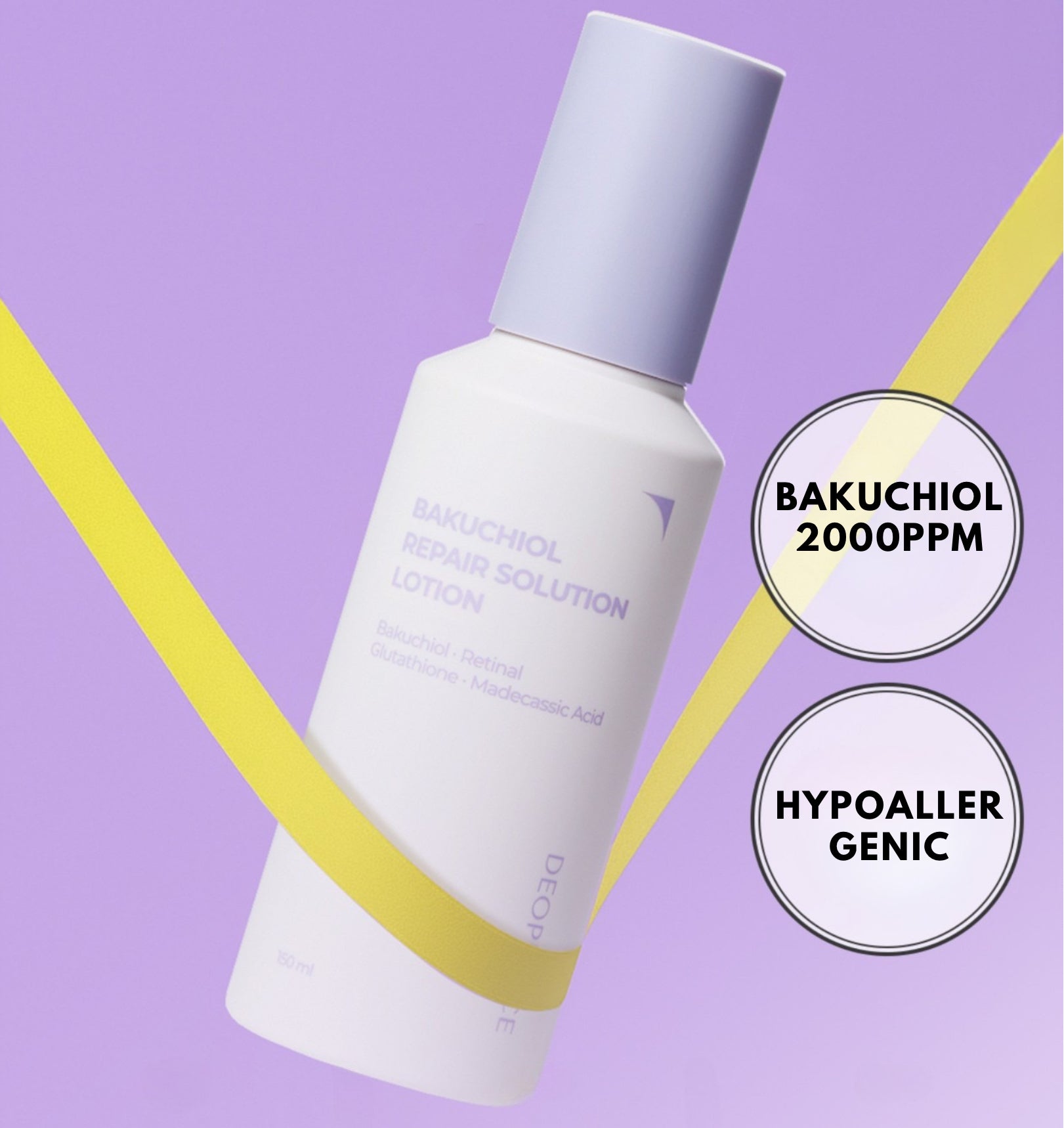 Experience gentle yet effective anti-aging care with the Deoproce Bakuchiol Repair Solution Lotion, a lightweight, deeply hydrating formula powered by Bakuchiol and Retinal to improve skin texture, minimize fine lines, and promote smoother, firmer skin—without irritation.