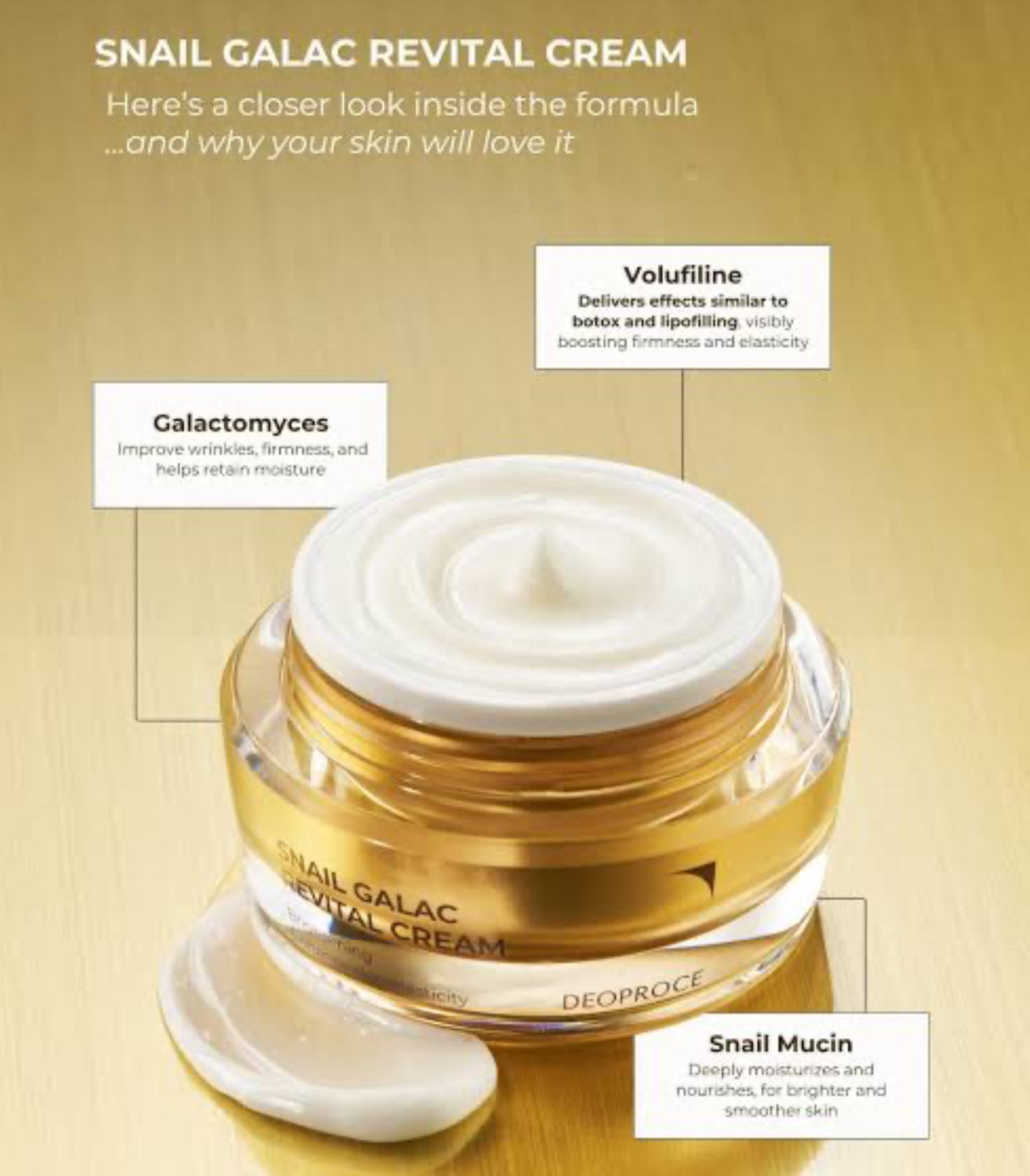 Deoproce Snail Galac Revital Cream delivers intense nourishment and skin rejuvenation through a powerful blend of snail mucin, galactomyces ferment filtrate, and volufiline.