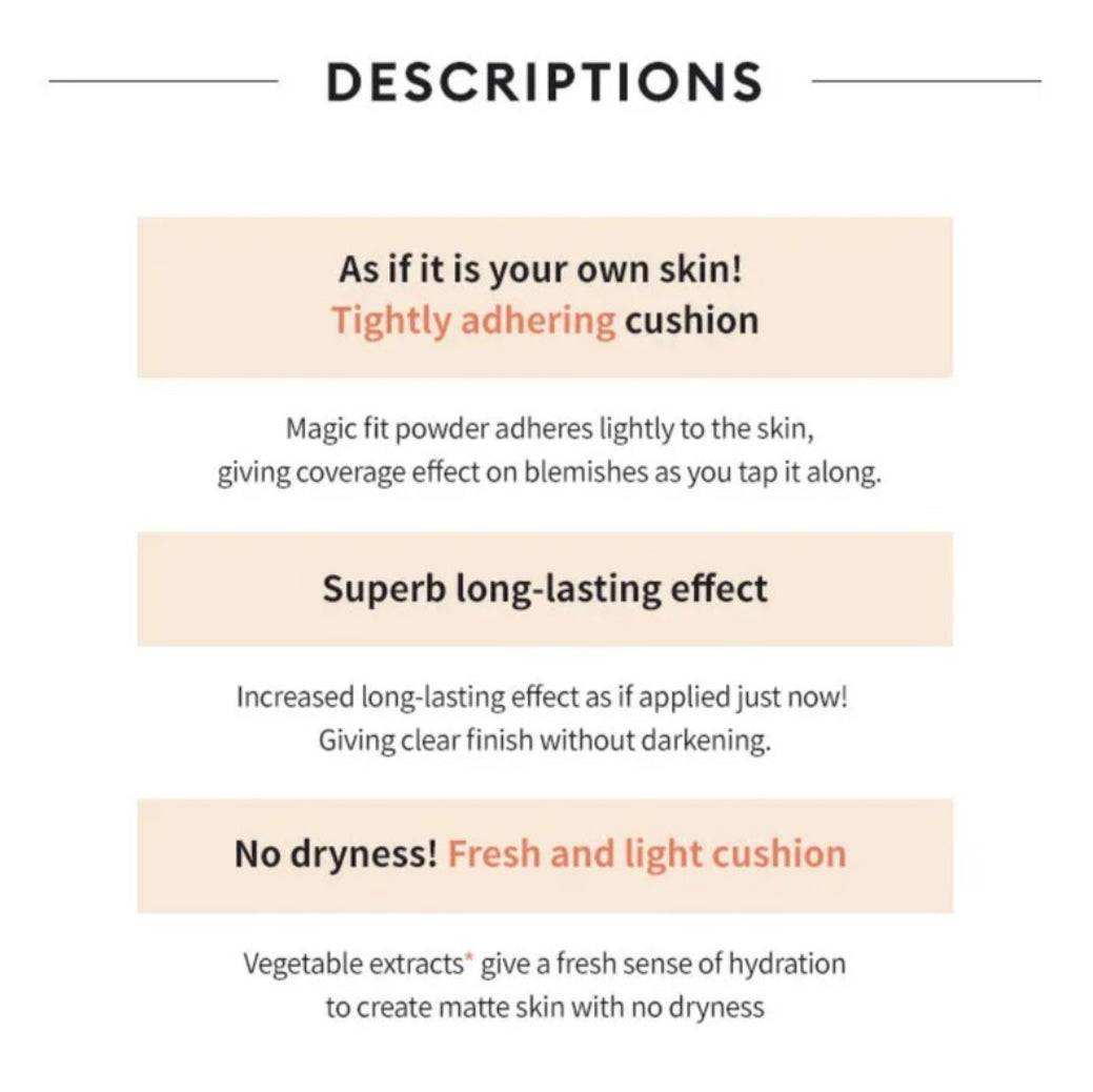 Achieve a flawless, high-coverage finish with this cushion compact, designed to conceal blemishes and even out skin tone for a smooth, radiant look. Silica bead powder controls sweat and sebum, while bamboo water and baobab fruit extract deliver long-lasting hydration. Enhanced with niacinamide for brightening, adenosine for anti-aging, and vitamin E for antioxidant care. Calendula and witch hazel soothe the skin, making this formula ideal for normal to dry skin types.